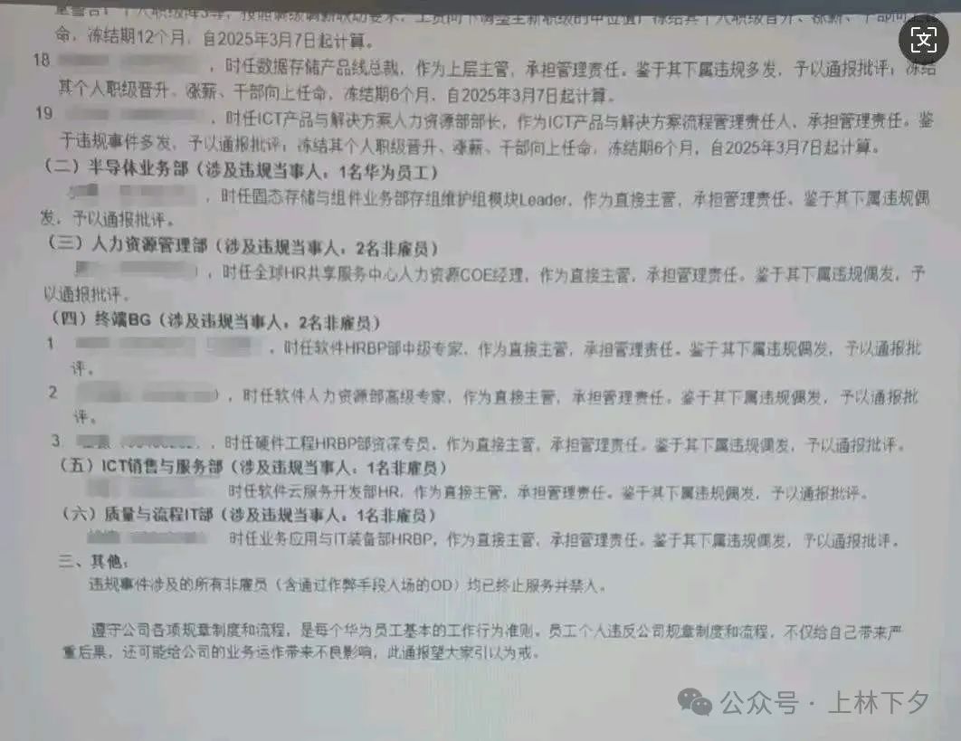 对于此次招聘违规事件,华为公司高度重视,立即成立了专项调查组,对涉事人员进行了全面调查。经核实,公司对涉事员工予以开除,并要求其退回非法获利、赔偿公司损失。同时,对相关管理者进行了通报批评、降职级、降薪等处罚,以严肃公司纪律,维护公平公正的招聘环境。36名直接参与者中,13人被除名并追缴违法所得,10人被辞退,13人遭劝退且职级降3级。26名相关管理者因监管失职被重罚,个人职级降6级,并面临6-12个月的晋升、涨薪冻结。通报特别强调,ICT产品与解决方案部门是“重灾区”,所有涉事非雇员均被终止合作并列入禁入名单。