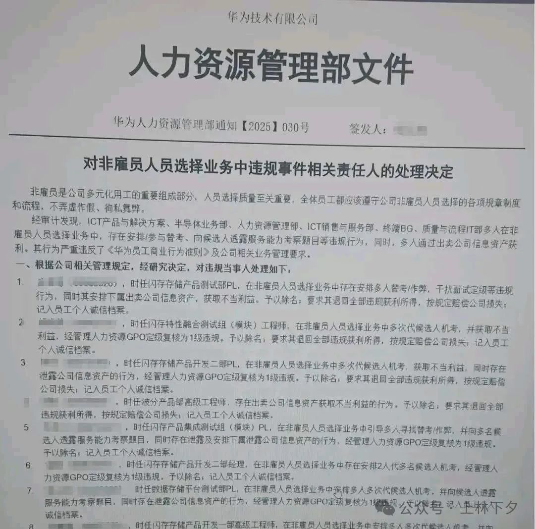 据华为内部通报显示,公司在非雇员人员选择业务中,发现部分员工存在安排或参与替考、向候选人透露考察题目等违规行为,严重违反了《华为员工商业行为准则》及公司相关业务管理规定。同时,还有多人通过出卖公司信息资产获利,损害了公司的利益和形象。